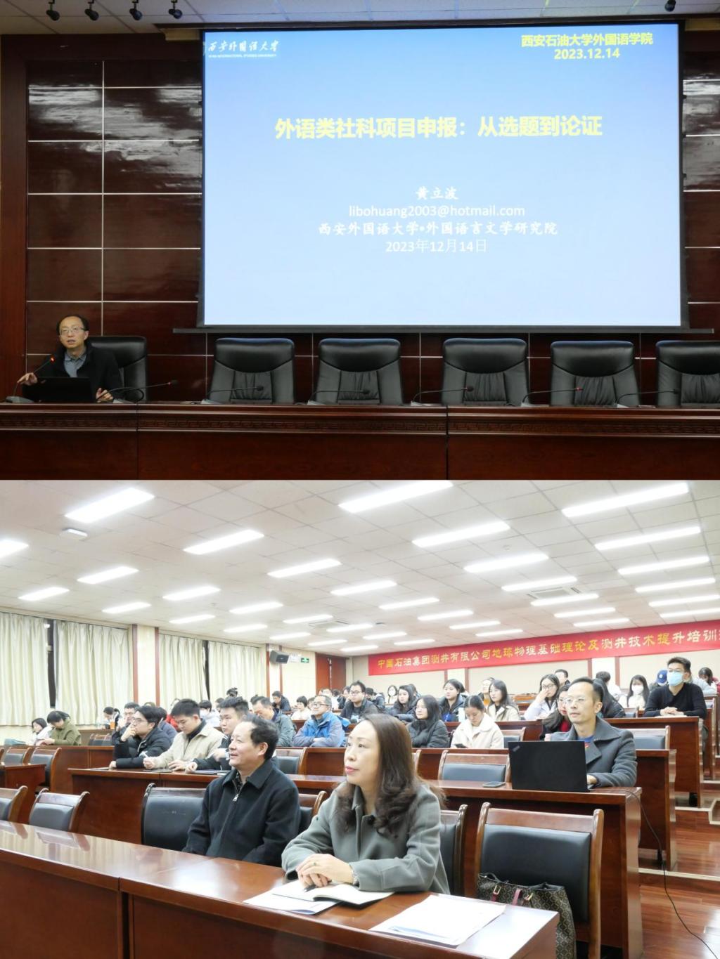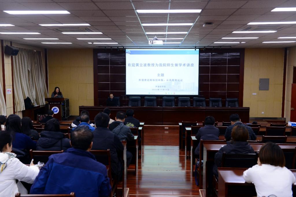 為提升學(xué)院師生社科類科研項(xiàng)目申報(bào)水平與質(zhì)量,12月14日下午,外國(guó)語學(xué)院邀請(qǐng)西安外國(guó)語大學(xué)二級(jí)教授、博士生導(dǎo)師黃立波教授開展了題為“外語類社科項(xiàng)目申報(bào):從選題到論證”學(xué)術(shù)講座。外國(guó)語學(xué)院師生共100余人聆聽了本次講座。講座由副院長(zhǎng)劉輝主持。