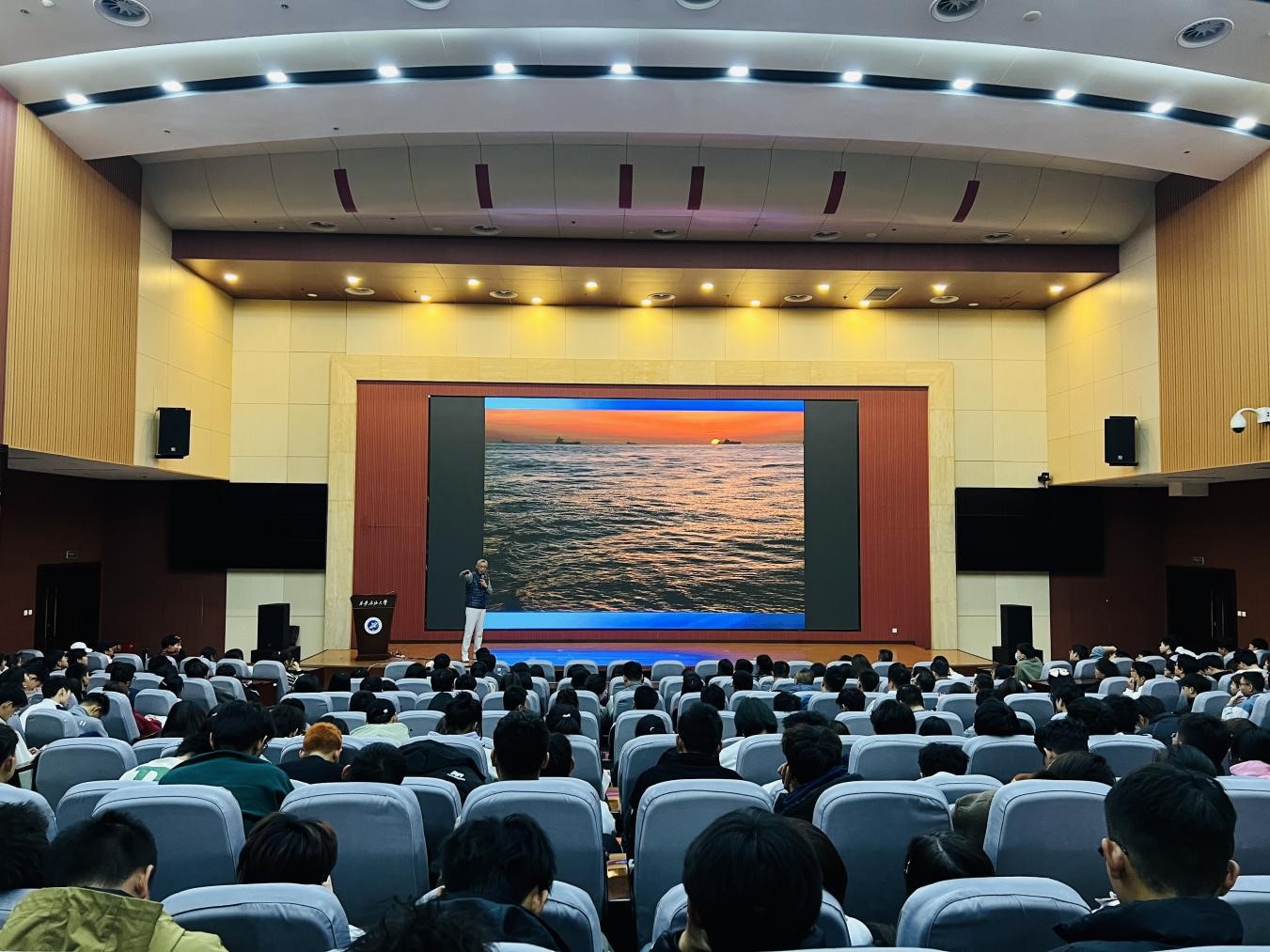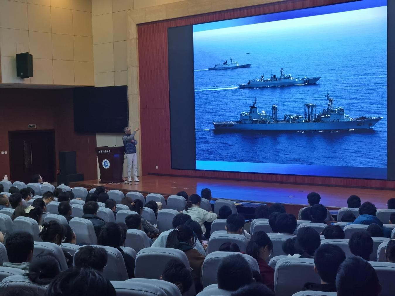 陳儼將軍結(jié)合曾在西沙群島、亞丁灣護(hù)航編隊(duì)等地工作的經(jīng)歷,以第五批護(hù)航編隊(duì)工作為例,從編隊(duì)的基本情況,護(hù)航任務(wù)的執(zhí)行過程,亞丁灣海盜活動的部分特點(diǎn),護(hù)航官兵執(zhí)勤、工作和生活狀況,亞丁灣護(hù)航行動的意義與啟示等五個(gè)方面對我國海軍護(hù)航工作做了全面的介紹。作為中國攝影家協(xié)會和中國新聞攝影協(xié)會會員,陳將軍通過百余幅自己拍攝的攝影作品,生動有趣的向在座師生還原了多彩的軍旅生活、展示了新時(shí)代海軍良好的精神風(fēng)貌,使其感受到了作為一名中國人民海軍、一名護(hù)航隊(duì)員的無上榮光。報(bào)告的最后,陳將軍激情滿懷的朗誦了其創(chuàng)作于亞丁灣護(hù)航任務(wù)期間的詩歌《遠(yuǎn)方》作為結(jié)束語:“親愛的戰(zhàn)友們,我們從遠(yuǎn)方回來了。9.2萬海里藍(lán)色航跡,192個(gè)晨暉暮影,825顆心靈相擁……當(dāng)國歌的第一聲音符撞擊心靈的時(shí)候,我們在心底默默而堅(jiān)定的對遠(yuǎn)方說:亞丁灣,我們來了!”