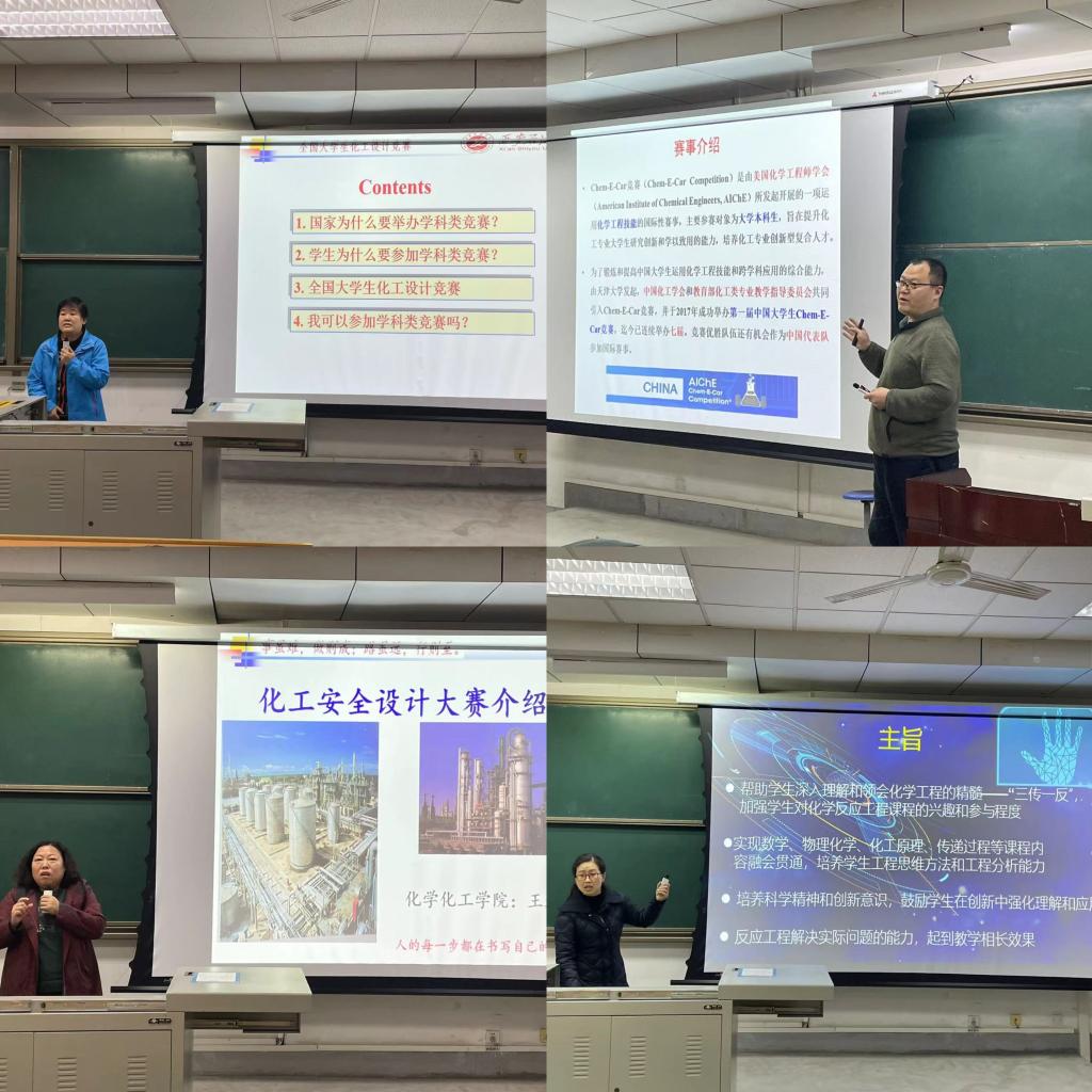 隨后,學科競賽指導老師劉菊榮、范崢、王進、唐璇依次就“全國大學生化工設計競賽”“全國大學生化工實驗大賽”“中國大學生Chem-E-Car競賽”“全國大學生化工過程數(shù)字創(chuàng)新競賽”“全國大學生化工安全設計大賽”“全國“互聯(lián)網(wǎng)+化學反應過程”大學生課模設計大賽”等化工學科競賽有針對性的介紹分析了競賽概況、賽程與賽制、競賽內容、競賽特點和我校以往獲獎情況,鼓勵同學們積極參與,勇于嘗試,提升自己的專業(yè)和創(chuàng)新能力,努力在競賽中取得新的突破。