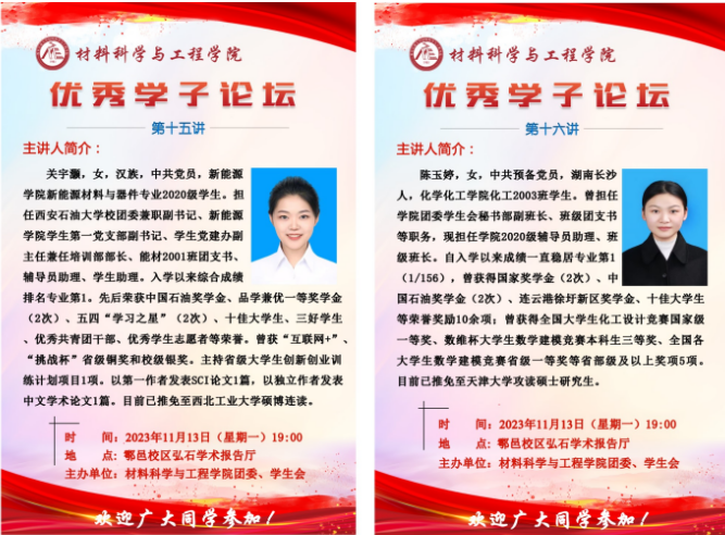 11月13日晚上,材料科學與工程學院在鄠邑校區(qū)圖書館弘石學術報告廳舉辦優(yōu)秀學子論壇第十五講和第十六講,本期邀請到的優(yōu)秀學子是榮獲國家獎學金、中石油獎學金等多項榮譽的新能源學院能材2001班關宇灝和化學化工學院化工2003班陳玉婷兩位同學,學院300余名本科生參加論壇。