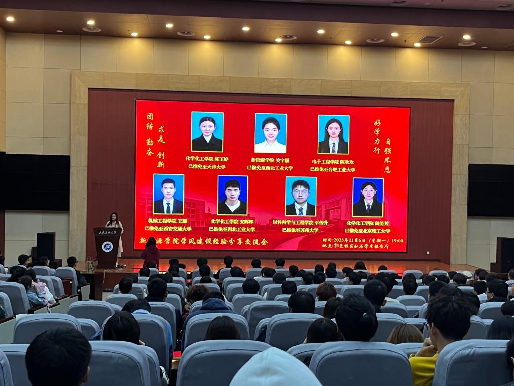 為了進(jìn)一步夯實(shí)學(xué)院三全育人工作理念,大幅提升育人實(shí)效,幫助學(xué)生做好考研規(guī)劃及保研升學(xué)指導(dǎo)工作,116日晚,新能源學(xué)院學(xué)風(fēng)建設(shè)經(jīng)驗(yàn)分享交流會在邑校區(qū)弘石學(xué)術(shù)報(bào)告廳舉行。大會邀請了來自我?;瘜W(xué)化工學(xué)院、電子工程學(xué)院、機(jī)械工程學(xué)院、材料科學(xué)與工程學(xué)院、新能源學(xué)院的7位優(yōu)秀學(xué)生代表做分享交流,學(xué)院2021級綜合測評成績前30%以及2022級全體本科生參會,會議由學(xué)院輔導(dǎo)員秦瑩穎主持。