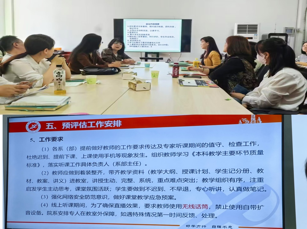 在教學工作會議環(huán)節(jié),大學外語第一教學部主任李雪梅就近期教學工作及本科教育教學預評估和期中考試等工作作了詳盡安排。李雪梅指出,本科教學評估有利于規(guī)范教學管理,提升教學質(zhì)量,各位教師務必認真學習評估“應知應會”手冊,嚴格遵守并執(zhí)行各項教學規(guī)范和要求。