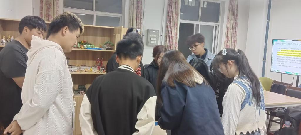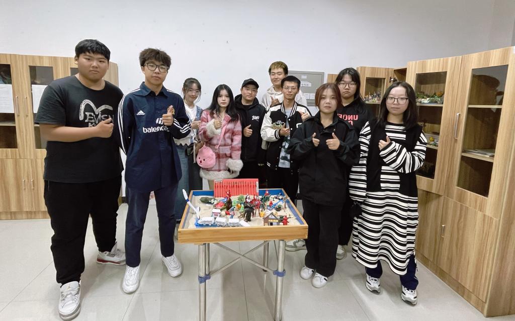 馬黎從沙盤療法的理論知識開展講解,詳細(xì)介紹了沙盤游戲的規(guī)則,指導(dǎo)同學(xué)們展開實(shí)踐。實(shí)踐分為兩個環(huán)節(jié):一是制作沙盤;二是討論與分享。在沙盤布置環(huán)節(jié),同學(xué)們井然有序,認(rèn)真選擇,積極構(gòu)思,逐步完成了團(tuán)隊(duì)的沙盤作品。隨后,每位同學(xué)對自己的擺放過程進(jìn)行了分享,訴說內(nèi)心的感受。通過團(tuán)體心理沙盤體驗(yàn),同學(xué)們獲得了心靈上的放松,也感受到被團(tuán)隊(duì)成員關(guān)注、支持的溫暖。最后,大家依次為沙盤作品命名,分享此次體驗(yàn)活動的感受和收獲。