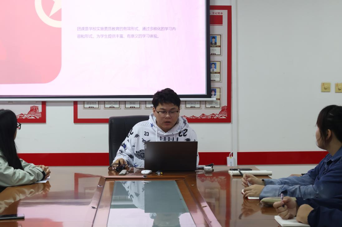 會(huì)議上,學(xué)院團(tuán)委組織部部長(zhǎng)張宇涵組織同學(xué)們團(tuán)課簡(jiǎn)介團(tuán)課的內(nèi)容、團(tuán)課形式、團(tuán)課的效果等四個(gè)方面學(xué)習(xí)團(tuán)課相關(guān)知識(shí)。他還為同學(xué)們舉出中石化集團(tuán)、華為集團(tuán)等單位開展團(tuán)課培養(yǎng)青年員工并取得顯著成效的案例,強(qiáng)調(diào)的團(tuán)課學(xué)習(xí)的重要性組織新入團(tuán)積極分子們學(xué)習(xí)團(tuán)歌,接受思想熏陶,培養(yǎng)愛黨愛國精神,增強(qiáng)責(zé)任意識(shí)。