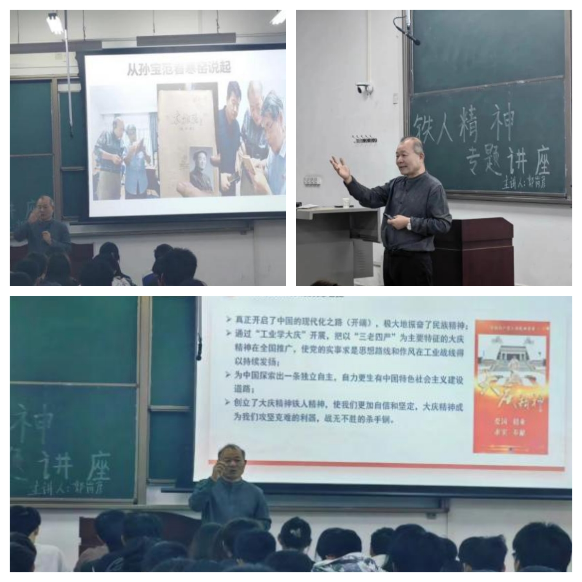 郭崗彥教授從“鐵人之最與鐵人之謎”“解析鐵人精神密碼”等方面逐一介紹了鐵人精神的發(fā)展脈絡(luò),圍繞鐵人愛黨愛國、忘我拼搏、苦干實(shí)干、科學(xué)求實(shí)、心系人民等方面講述鐵人王進(jìn)喜的先進(jìn)事跡和鐵人精神的內(nèi)涵。他首先從鐵人研究專家孫寶范看寒窯說起,凝練鐵人王進(jìn)喜為國分憂、為民族爭氣”的愛國主義精神、“寧可少活20年,拼命也要拿下大油田”的忘我拼搏精神、“有條件要上,沒有條件創(chuàng)造條件也要上”的艱苦奮斗精神、“為革命練一身硬功夫、真本事”的科學(xué)求實(shí)精神和“甘愿為黨和人民當(dāng)一輩子老黃牛”的無私奉獻(xiàn)精神,形象再現(xiàn)了老一輩石油人精神面貌,隨后介紹鐵人精神的出現(xiàn)對中國創(chuàng)造令世人矚目的輝煌業(yè)績,挺起民族工業(yè)大梁的重要意義,最后概括鐵人王進(jìn)喜立功、立德、立善、立魂的四不朽豐碑,激勵著一代代中國人民奮發(fā)進(jìn)取譜寫時代華章。