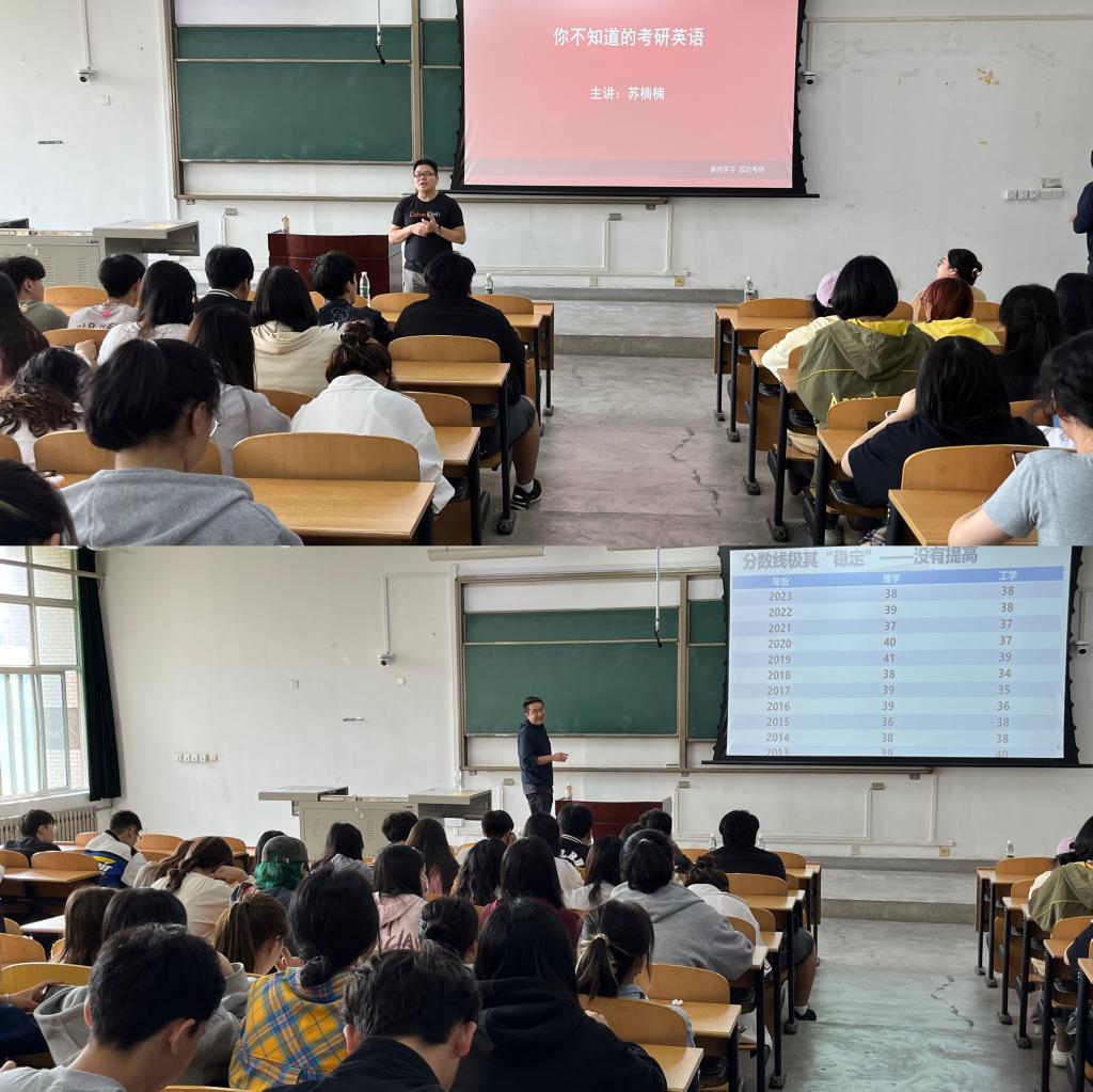 報告會上,蔡乾鋒老師結合自己的人生經歷分析當前社會發(fā)展形勢變化,就考研院校選擇、備考具體事宜、考研注意事項三方面進行了詳細講解,引導同學們搜集信息、合理報考學校和專業(yè),依據自身的學習情況確立適當?shù)膱罂寄繕耍瑤椭瑢W們規(guī)避考研常見風險,勉勵同學們認真踏實復習、科學選擇學校、積極應對考試,希望同學們能夠全力以赴,認真?zhèn)淇?。隨后,蘇楠楠老師從考研英語宏觀形勢、題型構成、備考重點和高效復習計劃等方面,展開了系統(tǒng)全面的分析和講解,一方面提高了學生對考研英語的認知,另一方面,為學生指明了考研英語備考的大方向。