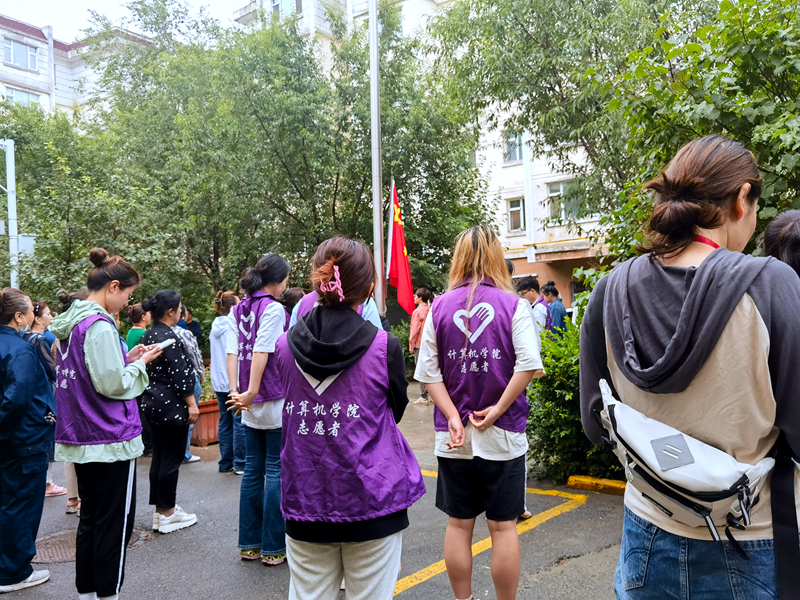 7月10日,社區(qū)組織升旗儀式,群眾自發(fā)的到達現(xiàn)場,狹小的廣場中擠滿了社區(qū)的男女老少。實踐團全體成員也參與其中,統(tǒng)一的紫色隊服和整潔的精神面貌為社區(qū)每周一的升旗活動增添了一道不一樣的風景。