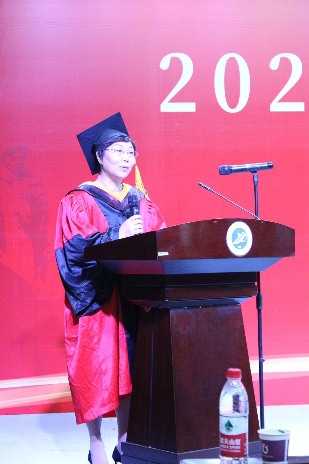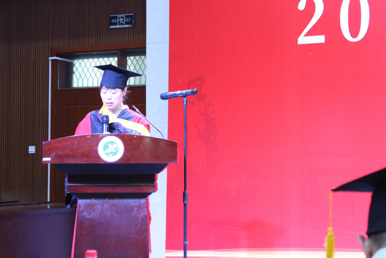 學(xué)院教授委員會(huì)主任、院長(zhǎng)王君萍致辭,回顧了2023屆畢業(yè)生的四年求學(xué)歲月,表達(dá)了對(duì)畢業(yè)生的真摯祝福,她寄語(yǔ)即將揚(yáng)帆啟航的畢業(yè)生,在面對(duì)各種艱難險(xiǎn)阻時(shí),始終秉承“誠(chéng)信、融合、盡責(zé)、創(chuàng)新”的良好院風(fēng),祝愿同學(xué)們將個(gè)人成長(zhǎng)與國(guó)家富強(qiáng)、民族復(fù)興、人民幸福的歷史偉業(yè)緊密相聯(lián)。