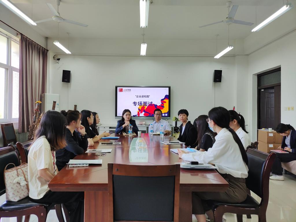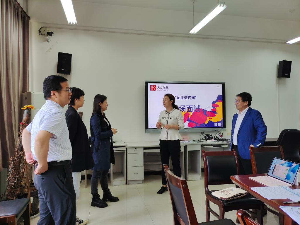 為進一步拓寬就業(yè)渠道,挖掘就業(yè)崗位,促進學生就業(yè),5月30日,陜西西咸新區(qū)人才集團有限公司侯冬穎一行4人應邀來訪交流并開展專場面試。人文學院黨委書記余小勇、黨委副書記盛丹、人文學院全體輔導員參加交流。