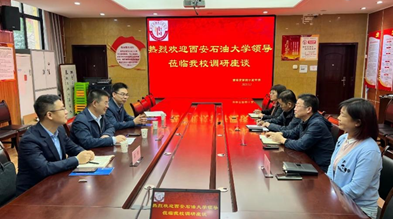 在授牌儀式前,與西安市第四十五中學黨支部書記王金暉、校長莫荻、副校長王玫、教導處主任王曉菲進行了深入交流座談。龐秉謙書記介紹了西安石油大學歷史沿革和發(fā)展概況,并對學校辦學特色、學科優(yōu)勢、特色專業(yè)、校園文化、招生政策等方面的情況進行了詳細的講解,并一同觀看了“西安石油大學建校70周年宣傳片”。