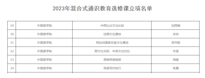 今日,教務處公布了西安石油大學關于2023年混合式通識教育選修課的立項名單,外國語學院有6門通識教育選修課程入選。
