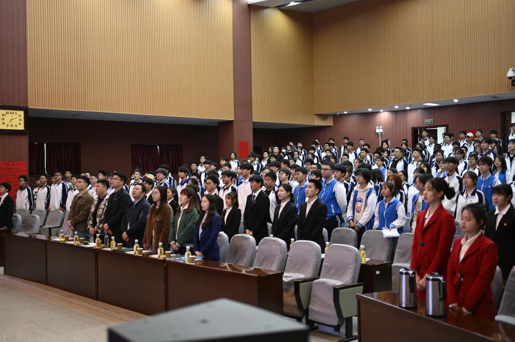 大會最后,馬小剛老師進行總結(jié)講話。講話中,他結(jié)合習近平總書記提出的“勤學、修德、明辨、篤實”八字對新一屆學生會提出四點要求:一要加強學習,不斷提高自身的學習能力和工作水平;二要樂于奉獻,提高道德休養(yǎng);三要明辨是非,明確職責;四要腳踏實地,扎實干事?!艾F(xiàn)在,青春是用來奮斗的;將來,青春是用來回憶的。”馬老師希望廣大同學不負韶華,費力拼搏,用實踐書寫無悔的青春華章。