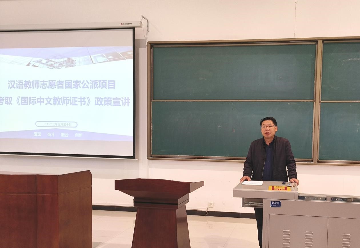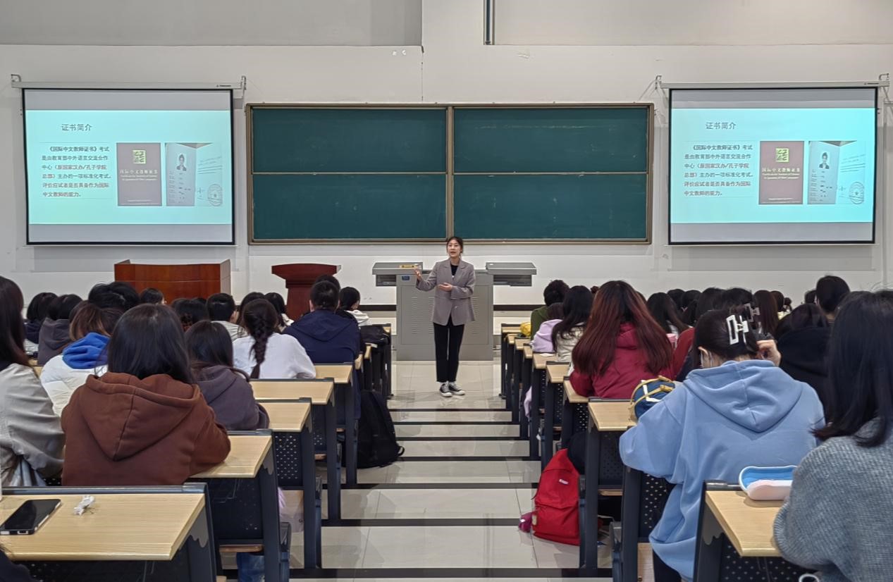 為進(jìn)一步做好學(xué)生職業(yè)規(guī)劃,促進(jìn)畢業(yè)生高質(zhì)量就業(yè)。3月30日學(xué)院在石工地科樓115舉辦漢語(yǔ)教師志愿者國(guó)家公派項(xiàng)目政策宣講會(huì)。邀請(qǐng)陜西省漢語(yǔ)國(guó)際教育研究會(huì)副秘書(shū)長(zhǎng)、《國(guó)際中文教師證書(shū)》西安外國(guó)語(yǔ)大學(xué)認(rèn)證中心考務(wù)負(fù)責(zé)人張青作專題宣講。副書(shū)記王業(yè)青主持,輔導(dǎo)員陳浩及2019級(jí)、2020級(jí)本科生和2022級(jí)研究生共計(jì)200余人參加了此次宣講會(huì)。
