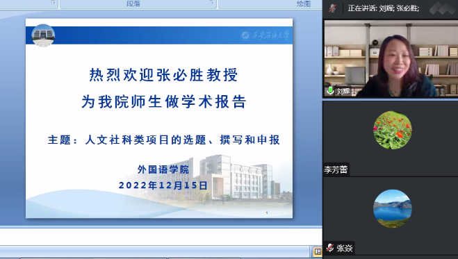 為進(jìn)一步做好人文社科基金項(xiàng)目申報(bào)組織工作,提高國(guó)家社科基金項(xiàng)目及其他基金項(xiàng)目的申報(bào)質(zhì)量,外國(guó)語(yǔ)學(xué)院于12月15日下午15:30,特別邀請(qǐng)貴州師范大學(xué)教授、博士生導(dǎo)師張必勝教授開展了題為“人文社科類項(xiàng)目的選題、撰寫和發(fā)表”的線上專題講座。外國(guó)語(yǔ)學(xué)院全體教師、全體翻譯碩士研究生共200余人在線參加了本次講座,講座由劉輝副院長(zhǎng)主持。