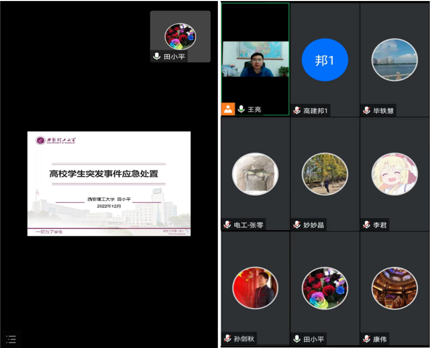 為深入貫徹全國(guó)高校思想政治教育工作會(huì)議精神,落實(shí)《西安石油大學(xué)卓越輔導(dǎo)員素質(zhì)能力提升計(jì)劃》,進(jìn)一步提升我校輔導(dǎo)員應(yīng)急處突能力,按照2022年輔導(dǎo)員專題培訓(xùn)工作安排,1216日,學(xué)生工作部組織全校學(xué)工干部在騰訊會(huì)議上開(kāi)展2022年輔導(dǎo)員專題培訓(xùn)第五講高校學(xué)生突發(fā)事件應(yīng)急處置。培訓(xùn)由西安理工大學(xué)學(xué)生工作部、研究生工作部、武裝部部長(zhǎng)田小平主講,我校學(xué)生工作部部長(zhǎng)王亮主持。