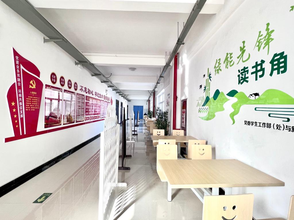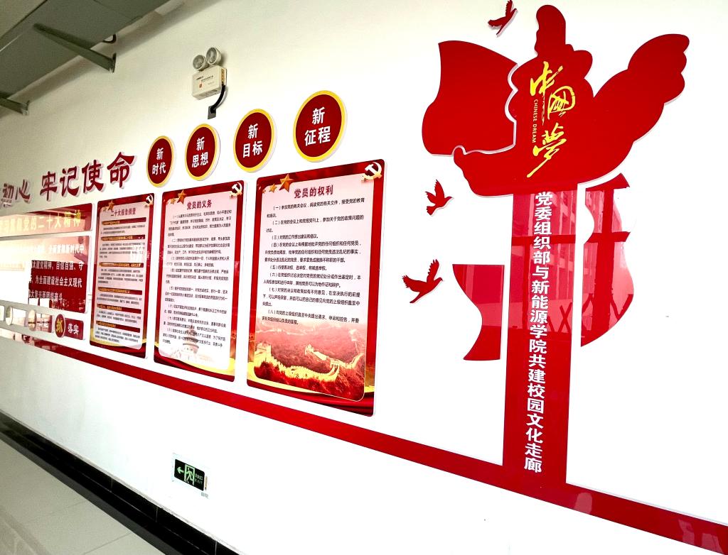 學(xué)院充分利用校園文化走廊和學(xué)生工作辦公室,與校黨委組織部共建了黨建文化長廊,建成了涵蓋黨的二十大精神、數(shù)讀黨的二十大報告、黨的二十大報告摘登、黨的宗旨、黨的紀(jì)律、黨員的義務(wù)、黨員的權(quán)利等為主題的文化墻,切實將空白墻變?yōu)?/span>學(xué)習(xí)墻。走廊緊跟新時代步伐,以展板與標(biāo)語為載體,生動新穎、圖文并茂地展示黨的二十大報告內(nèi)容,方便師生在工作和學(xué)習(xí)之余隨時置身其中,潛移默化地接受黨的二十大精神洗禮,不斷推動黨的二十大精神入腦入心。文化走廊充分利用有限的區(qū)域發(fā)揮宣傳作用,不斷以科學(xué)的理論武裝師生,以正確的輿論引導(dǎo)師生,以高尚的精神塑造師生,同時又與綠能先鋒讀書角交相呼應(yīng),為推動黨建與學(xué)風(fēng)建設(shè)深度融合提供了新的平臺。