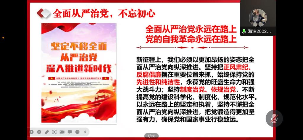 梁美玉:本次活動不管是視頻中黨對腐敗分子的絕不姑息還是同學(xué)們對黨內(nèi)腐敗現(xiàn)象的義憤填膺,都讓我意識到全面從嚴(yán)治黨是馬克思主義政黨的鮮明品格,是百年大黨風(fēng)華正茂的奧秘所在,是實現(xiàn)中華民族偉大復(fù)興的根本保證。