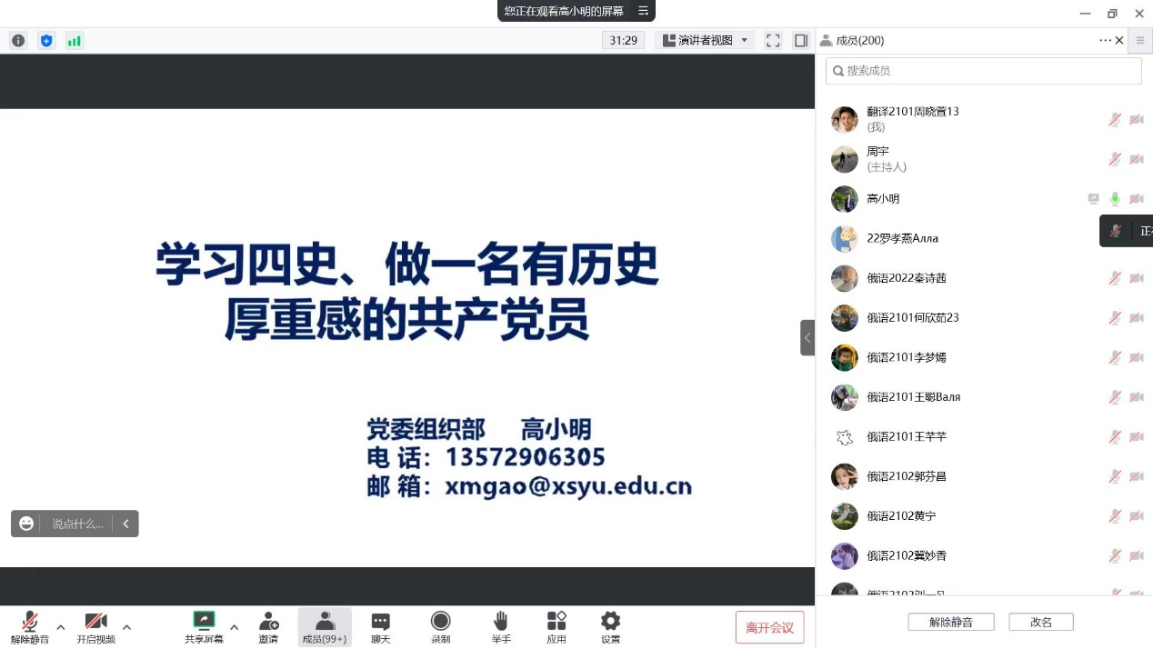高老師以“學(xué)習(xí)四史、做一名有歷史厚重感的共產(chǎn)黨員”為主題,以世界經(jīng)濟千年史、不同時期中國國內(nèi)生產(chǎn)總值占世界生產(chǎn)總值的比重、黨領(lǐng)導(dǎo)下的中國國內(nèi)生產(chǎn)總值增速與其他國家增速的比較為引,并結(jié)合黨的歷次全國代表大會召開情況,圍繞“為什么學(xué)習(xí)‘四史’、‘四史’學(xué)什么、如何做一名有歷史厚重感的黨員”三個方面,對“四史”教育的意義、“四史”學(xué)習(xí)重要性、“四史”學(xué)習(xí)內(nèi)容和為什么入黨要宣誓等進行了詳細講解。
