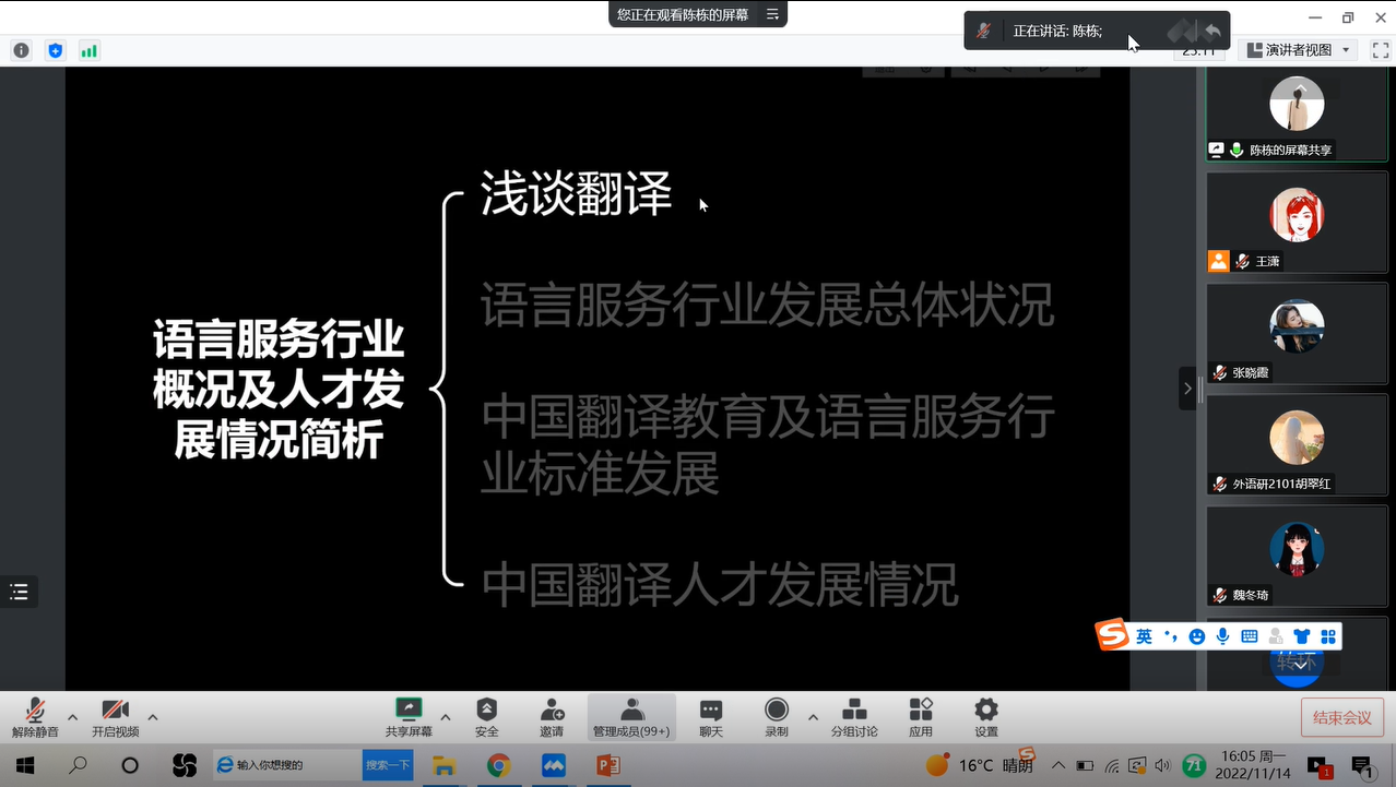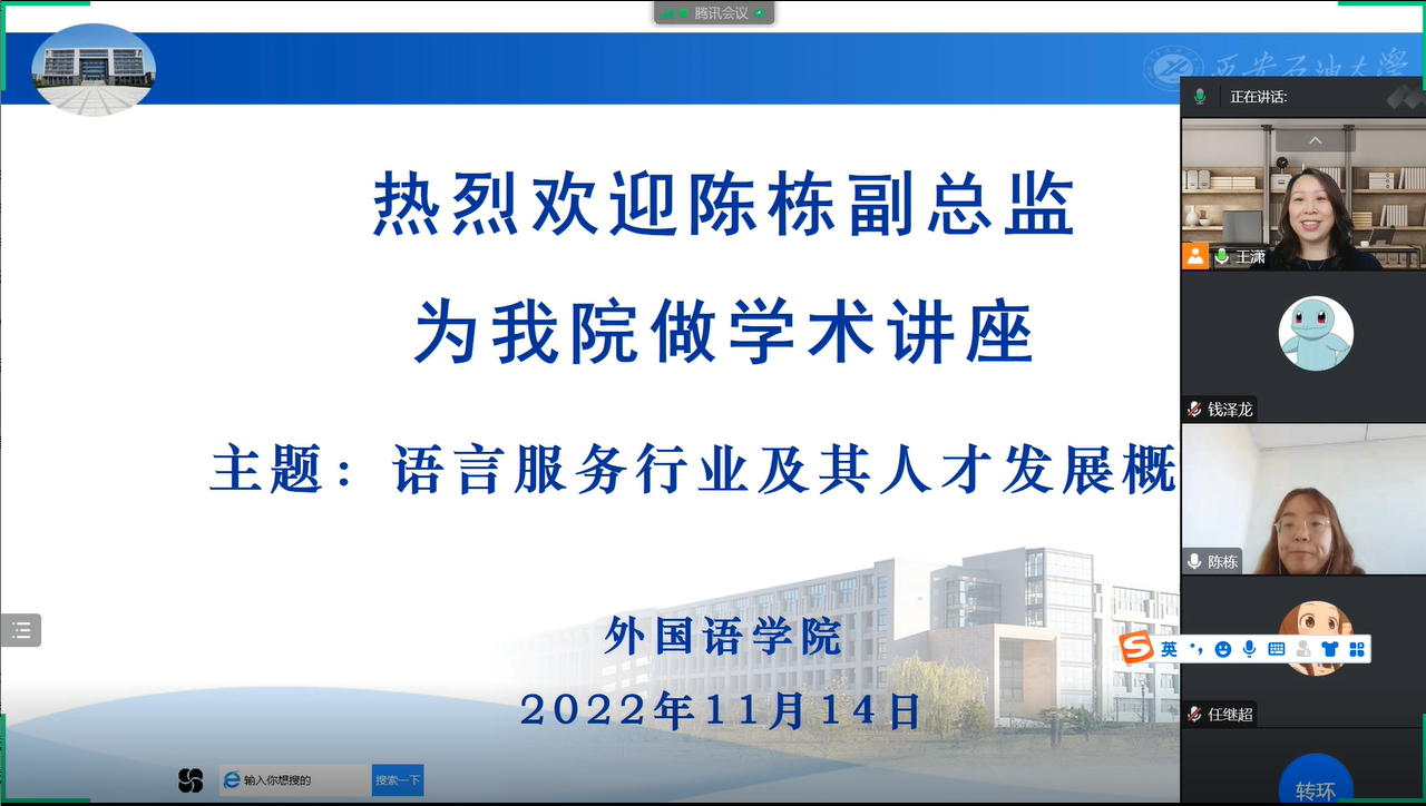 為進(jìn)一步做好2023屆畢業(yè)生就業(yè)創(chuàng)業(yè)工作,加強(qiáng)學(xué)生就業(yè)指導(dǎo),強(qiáng)化就業(yè)育人實(shí)效,提高翻譯碩士研究生的職業(yè)素養(yǎng),幫助學(xué)生了解語言服務(wù)行業(yè)的基本現(xiàn)狀,引導(dǎo)學(xué)生從實(shí)際出發(fā)選擇職業(yè)和崗位,做好職業(yè)規(guī)劃。11月14日下午,外國語學(xué)院邀請中譯語通(陜西)科技有限公司語言服務(wù)事業(yè)群陳棟副總監(jiān),為我校MTI全體研究生作題為“語言服務(wù)行業(yè)及其發(fā)展概況”的線上專題講座。外國語學(xué)院MTI全體研究生100余人參加講座,講座由副院長劉輝主持。