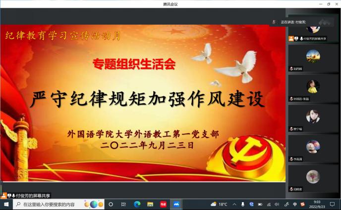 根據(jù)學(xué)院黨委關(guān)于開(kāi)展第五個(gè)紀(jì)律教育學(xué)習(xí)宣傳月活動(dòng)要求,9月23日上午,外國(guó)語(yǔ)學(xué)院大學(xué)外語(yǔ)第一教學(xué)部黨支部通過(guò)騰訊會(huì)議上召開(kāi)線(xiàn)上“嚴(yán)守紀(jì)律規(guī)矩、加強(qiáng)作風(fēng)建設(shè)”專(zhuān)題組織生活會(huì)。黨支部全體黨員參加會(huì)議。會(huì)議由黨支部書(shū)記付俊芳主持。