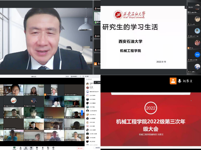 9月17日-19日,機(jī)械工程學(xué)院召開2022級全體本研新生入學(xué)教育線上會(huì)議。機(jī)械工程學(xué)院院長竇益華、副院長崔璐、黨委副書記劉冰先后應(yīng)邀出席會(huì)議,會(huì)議分別由輔導(dǎo)員歐紅娟、劉思文主持。竇益華院長向同學(xué)們介紹相關(guān)學(xué)科專業(yè)的特色和優(yōu)勢,開展專業(yè)教育,圍繞我校“石油精神辦學(xué),鐵人精神育人,延安精神鑄魂”的特色,將石油精神鐵人精神教育和專業(yè)教育相結(jié)合,引導(dǎo)新生領(lǐng)悟石油精神鐵人精神內(nèi)涵,奮發(fā)圖強(qiáng),刻苦學(xué)習(xí)專業(yè)知識(shí),掌握扎實(shí)本領(lǐng)。崔璐副院長根據(jù)學(xué)校研究生相關(guān)管理制度,結(jié)合院系實(shí)際,開展新生校規(guī)校紀(jì)教育,并組織新生觀看疫情防控知識(shí)。劉冰副書記參加本科生會(huì)議指出,疫情期間實(shí)行靜態(tài)化管理,各位新生要嚴(yán)格落實(shí)疫情管理規(guī)定,定期進(jìn)行核酸檢測,養(yǎng)成公共區(qū)域戴口罩的良好習(xí)慣。歐紅娟、劉思文老師從遵守校規(guī)校級及安全方面做出教育,并希望同學(xué)們注意宿舍安全及網(wǎng)絡(luò)安全等設(shè)立好學(xué)習(xí)目標(biāo),保持良好精神面貌,融入集體,要結(jié)合自身實(shí)際,確立好未來發(fā)展方向。