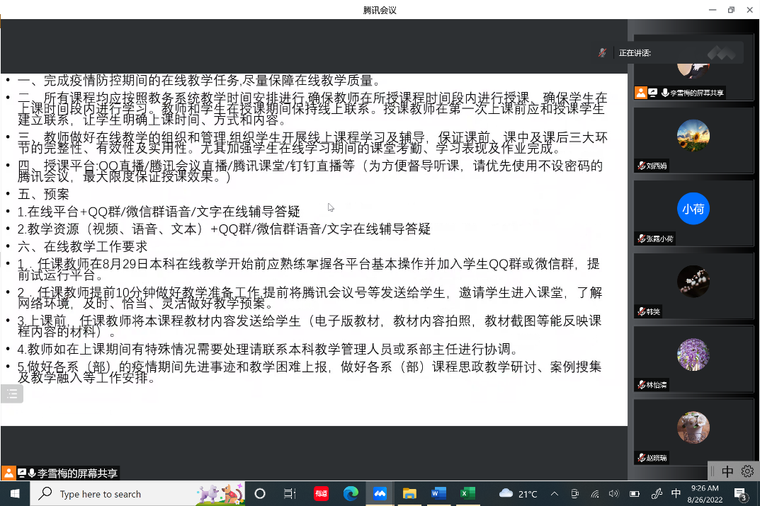 接下來,李雪梅主任對(duì)新學(xué)期教學(xué)工作進(jìn)行了安排部署,帶領(lǐng)一部教師學(xué)習(xí)西石大[2022]5號(hào)文件,向大家傳達(dá)了學(xué)校學(xué)院疫情防控精神,要求每位教師落實(shí)疫情防控政治責(zé)任,遵守學(xué)校疫情防控管理規(guī)定,認(rèn)真開展開學(xué)線上教學(xué),落實(shí)好每一位老師的每一堂課,確保教學(xué)質(zhì)量,加強(qiáng)思想政治教育,及時(shí)掌握學(xué)生思想動(dòng)態(tài),確保師生健康安全、學(xué)校和諧穩(wěn)定。
