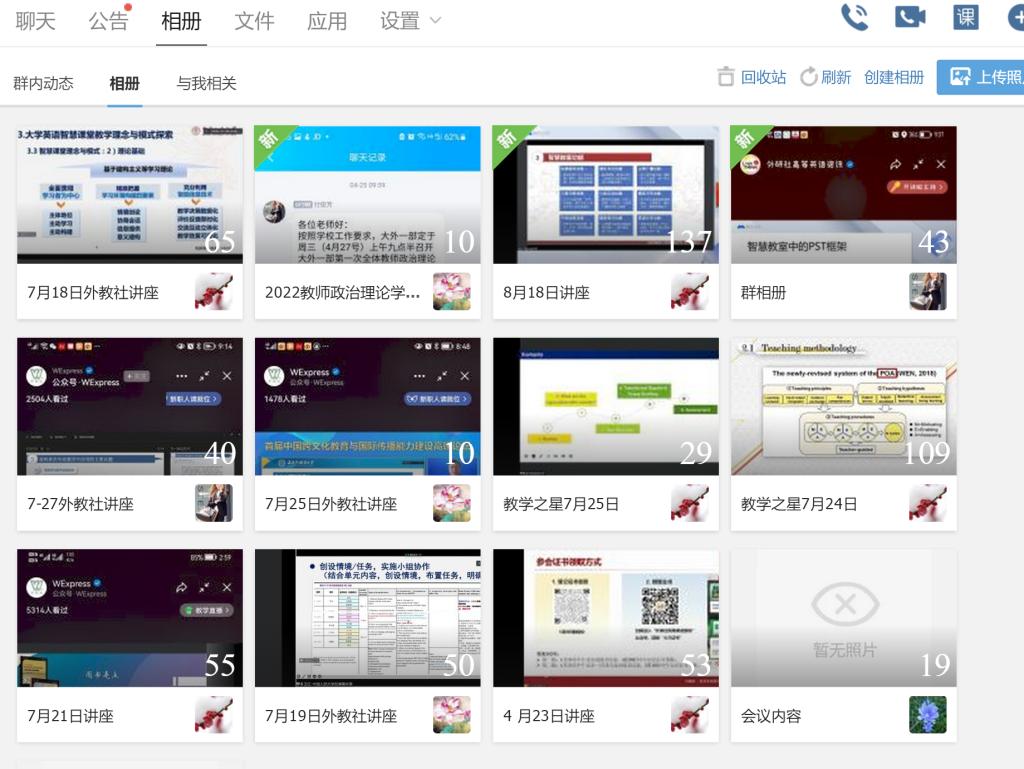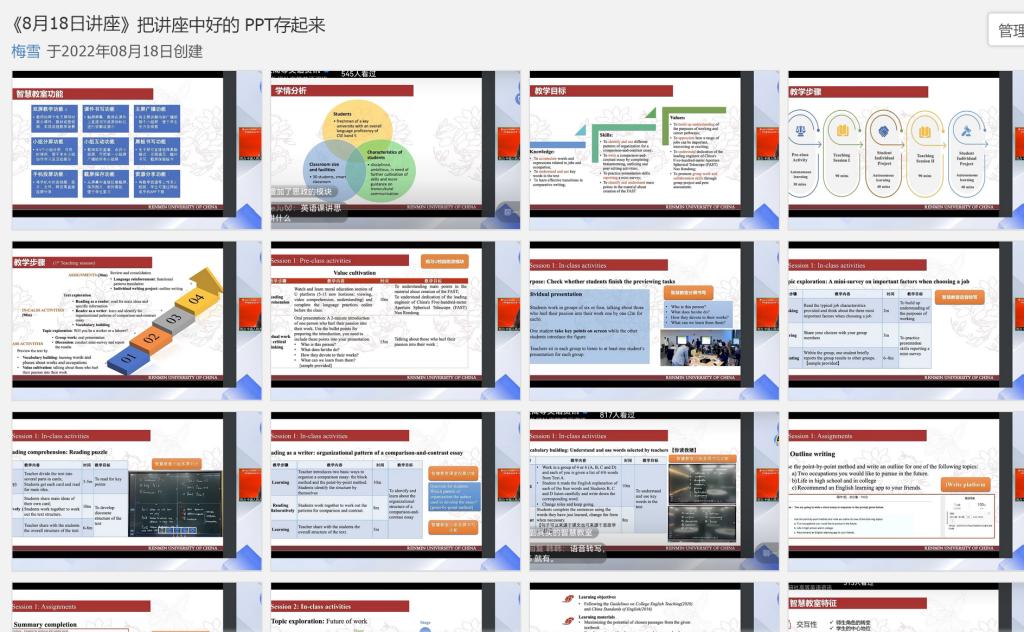大學外語教學一部根據教學部所承擔的教學任務特點,教師個人發(fā)展需求,以及院校特色選取了研修班和論壇日程安排中部分講座作為必修內容,如“高質量發(fā)展背景下一流課程建設理念與實施路徑”、“智慧賦能:打造WE外語教育的共同未來”、“文明互鑒:高校外語教師中外人文素養(yǎng)提升”、“外語課程思政的縱深推進:人才培養(yǎng)的目標、理念與路徑”、“學科智慧教室環(huán)境下的新型課堂教學模式創(chuàng)新與實踐云專題”等,要求全體教師認真學習,互相交流學習心得,并在教學部工作群中建立了相應的講座資料群相冊,留存講座重要內容,以供后期查閱學習。同時,大外教學一部也鼓勵教師們根據自己的教研興趣選修研修班和論壇日程中其它講座內容。