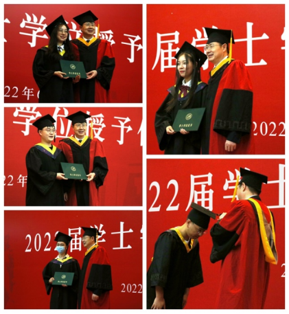 接下來(lái),畢業(yè)班輔導(dǎo)員張靚宣讀獲學(xué)位學(xué)生名單,竇益華院長(zhǎng)、王治國(guó)副院長(zhǎng)、崔瑩副院長(zhǎng)為同學(xué)們逐一頒發(fā)學(xué)士學(xué)位證書、撥正流蘇并與學(xué)生合影。同學(xué)們深情地鞠躬,昂揚(yáng)地從老師們手中接過(guò)學(xué)位證書,帶著朝氣開(kāi)啟建功立業(yè)新時(shí)代的征程。