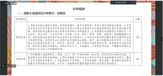 之后,劉老師從教育維度、創(chuàng)新維度、團隊維度、商業(yè)維度、社會價值維度,公益維度、發(fā)展維度等多方面詳細的講解高教主賽道和青年紅色筑夢之旅賽道的評審要點及評分細則,并深入淺出,舉例說明怎樣體現(xiàn)出“教育維度”和“帶動就業(yè)”,劉老師結合自身參賽經(jīng)驗和評審經(jīng)驗,對青紅旅項目存在的共性問題提出意見建議,著重強調路演PPT的專業(yè)性及重要性。