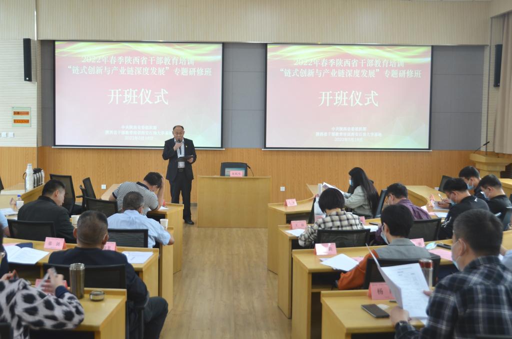 2022年5月18日上午,由省委組織部主辦、我校干訓(xùn)基地承辦的2022年春季陜西省干部教育培訓(xùn)“鏈?zhǔn)絼?chuàng)新與產(chǎn)業(yè)鏈深度發(fā)展”專(zhuān)題研修班,在我校明德校區(qū)培訓(xùn)中心順利開(kāi)班。繼續(xù)教育學(xué)院副院長(zhǎng)吳民生出席開(kāi)班儀式并致歡迎辭,來(lái)自省市黨政機(jī)關(guān)的50余名領(lǐng)導(dǎo)干部參加了開(kāi)班儀式。儀式由班主任康高梅子主持。