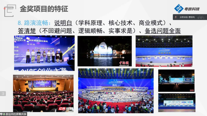 “好的項目要好好講出來”,蔡老師以往年國家級金獎項目為例,為同學(xué)們總結(jié)了金獎項目的八大特征,幫助參賽團隊準(zhǔn)確完善自身項目,提升路演答辯技巧。