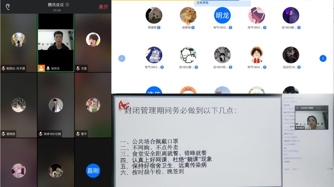 當(dāng)晚,根據(jù)工作安排,電子工程學(xué)院各班召開線上疫情防控主題班團(tuán)會(huì)。在各班的主題班團(tuán)會(huì)上,輔導(dǎo)員就學(xué)校近日關(guān)于疫情防控的各項(xiàng)要求向?qū)W生們提出了封閉管理期間六準(zhǔn)則:一是在校園公共場(chǎng)所嚴(yán)格佩戴好口罩;二是食堂就餐“錯(cuò)峰就餐、間隔就座”,購(gòu)餐時(shí)要保持一米間隔;三是暫停線上購(gòu)物與外賣,嚴(yán)禁通過圍墻投遞物品;四是認(rèn)真上好網(wǎng)課,杜絕 “躺課”現(xiàn)象;五是保持宿舍衛(wèi)生,遠(yuǎn)離各類傳染??;六是做好晨午檢、晚簽到打卡,力爭(zhēng)打卡率達(dá)到100%。