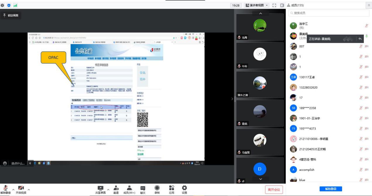 為強(qiáng)化學(xué)生科研能力的培養(yǎng),有助于畢業(yè)生開展畢業(yè)論文寫作,316日下午,圖書館參考咨詢部康美娟老師為同學(xué)們主講了數(shù)據(jù)庫應(yīng)用專題講座?;谝咔榉揽乜紤],此次講座采取了線上形式,共有155名畢業(yè)生參加了講座。