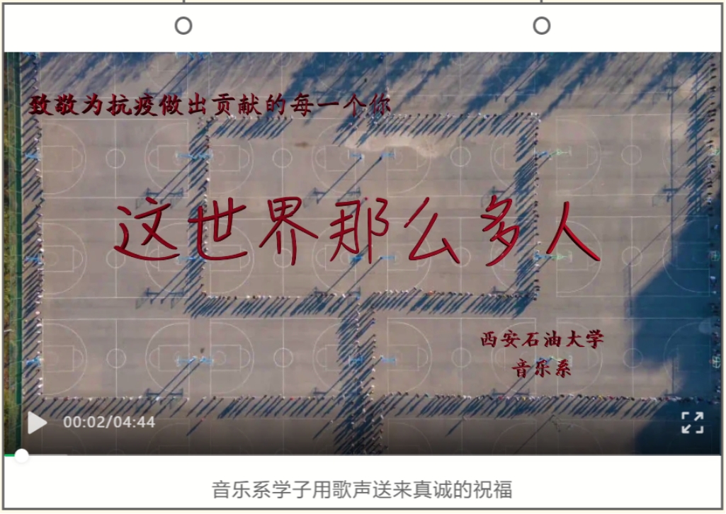 我系抗疫系列視頻豐富了學(xué)生們封閉的宿舍文化活動(dòng),在同學(xué)們中間引起了強(qiáng)烈反響。同學(xué)們制作的視頻有的風(fēng)趣幽默,有的嚴(yán)肅活潑,有的深情感人,體現(xiàn)了我系學(xué)生良好的專(zhuān)業(yè)素養(yǎng)和積極向上的人生態(tài)度。他們是音樂(lè)系的縮影,是西石大的縮影。作為西安石油大學(xué)音樂(lè)系的一份子,希望長(zhǎng)安,常安!勝利就在遠(yuǎn)方,讓我們?cè)倥Φ貓?jiān)持一下,一起迎來(lái)更加美好的明天!