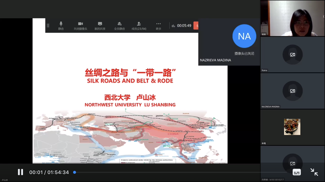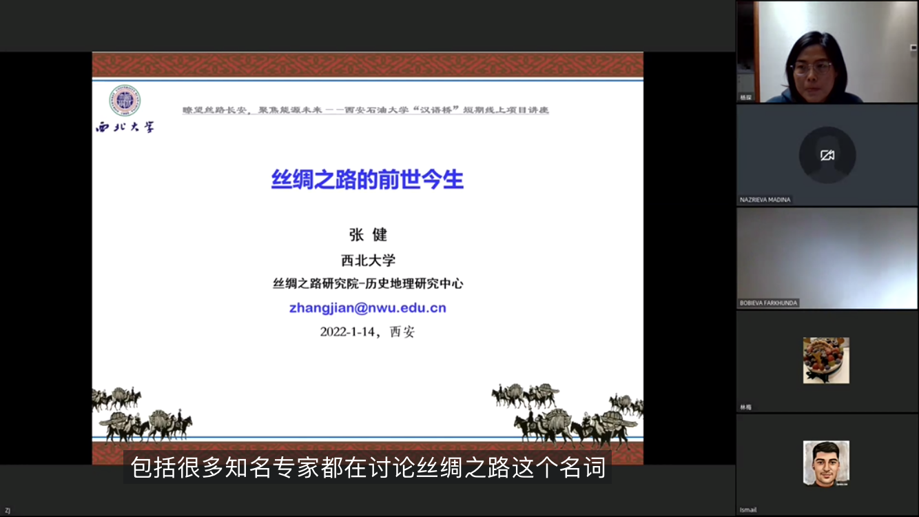 1月14日-15日,國際教育學院(絲路能源學院)特邀西北大學絲綢之路研究院院長、現(xiàn)代學院院長、博士生導師盧山冰教授及西北大學絲綢之路研究院張健副教授做了“一帶一路”線上專題講座,教育部“漢語橋”線上短期項目班學員及來自塔吉克斯坦、烏茲別克斯坦等國外合作“一帶一路”沿線國家合作單位的80名學員參加了講座,國際教育學院(絲路能源學院)相關負責人出席了講座。