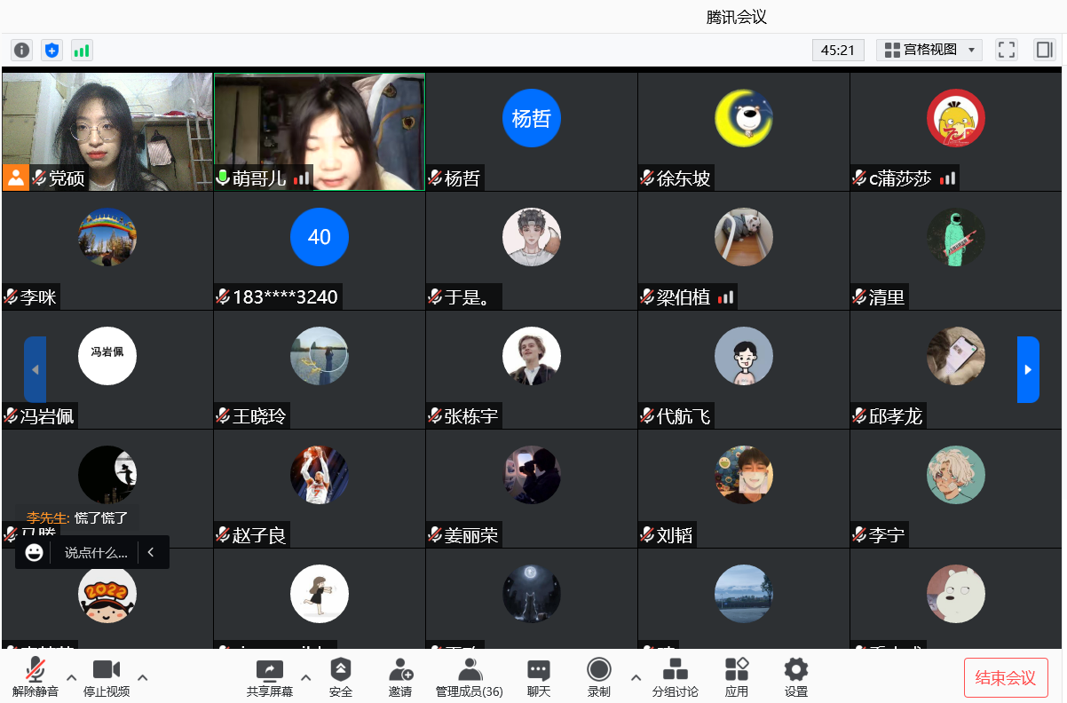 2020級研究生以“講好抗疫故事,宣傳抗疫精神,體現(xiàn)國家擔(dān)當(dāng)”為主題,與會研究生集中學(xué)習(xí)了習(xí)近平總書記關(guān)于疫情防控工作的重要講話和指示精神,通過講述抗疫小故事、分享疫情期間的個人學(xué)習(xí)和生活、探討特殊時期青年學(xué)子如何擔(dān)當(dāng)作為等形式進行了深入交流。會議主持人黨碩針對當(dāng)前班級同學(xué)思想動態(tài)、疫情防控、科研學(xué)習(xí)、日常生活等方面提出了建議和要求。