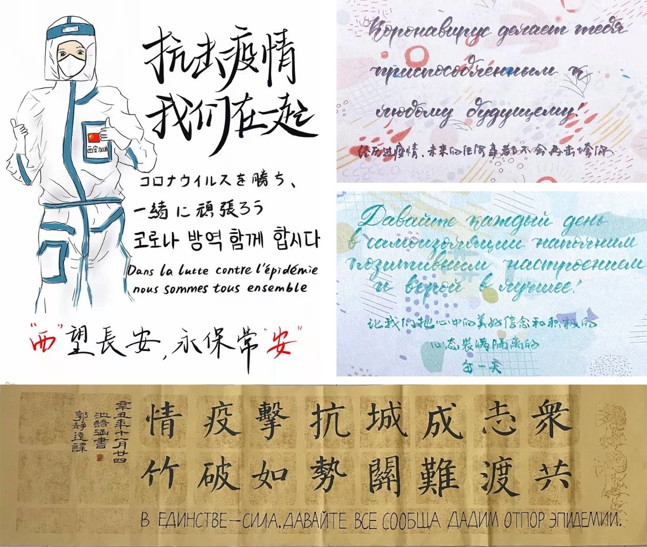 面對(duì)這場(chǎng)沒(méi)有硝煙的戰(zhàn)爭(zhēng),學(xué)院積極引導(dǎo)學(xué)生充分發(fā)揮專業(yè)優(yōu)勢(shì)和個(gè)人特長(zhǎng),將習(xí)近平總書(shū)記“營(yíng)造萬(wàn)眾一心阻擊疫情的輿論氛圍,凝聚起眾志成城、共克時(shí)艱的強(qiáng)大正能量”的重要指示落到實(shí)處。用俄語(yǔ)、法語(yǔ)、西班牙語(yǔ)、韓語(yǔ)、日語(yǔ)……等多語(yǔ)種錄制抗疫宣傳視頻,為戰(zhàn)疫加油,為西安加油。并鼓勵(lì)大家發(fā)揮個(gè)人特長(zhǎng),用筆墨鼓舞抗疫斗志、禮贊抗疫英雄,傳遞“西石大溫度”。