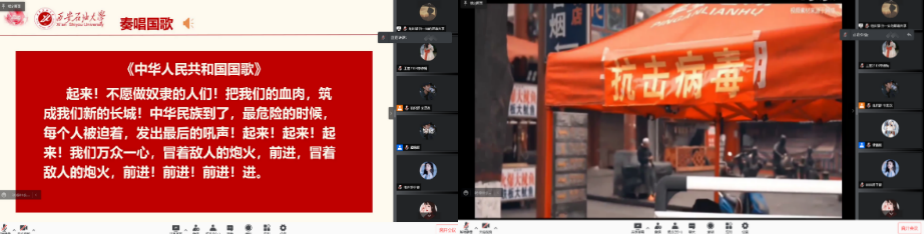 在慷慨嘹亮的國歌、團(tuán)歌聲中,與會(huì)師生通過觀看視頻的方式,體會(huì)著不畏艱難、勇往直前的抗疫畫面,大家一起致敬抗疫一線工作者的辛苦付出。疫情突來,三秦遭難,章芯蕊、李旻彤、王鏝婷三位同學(xué)分享抗疫故事,讓與會(huì)全體師生記住了舍小家為大家堅(jiān)守奮斗一線的輔警周剛和蒸出一千多個(gè)饅頭的“西安好人”張花等抗疫模范。