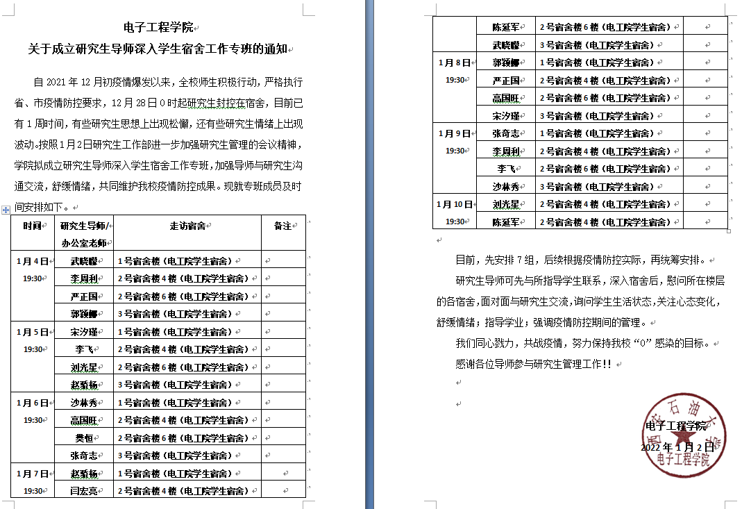 面對(duì)目前嚴(yán)峻復(fù)雜的疫情,按照“疫情就是命令,防控就是責(zé)任”的要求,學(xué)院全體研究生導(dǎo)師與研究生一起,同心戮力,抗擊疫情,扎實(shí)落實(shí)研究生導(dǎo)師第一責(zé)任人職責(zé),線下線上指導(dǎo)、深入學(xué)生宿舍慰問(wèn),確保我院研究生學(xué)習(xí)、生活平穩(wěn)有序。