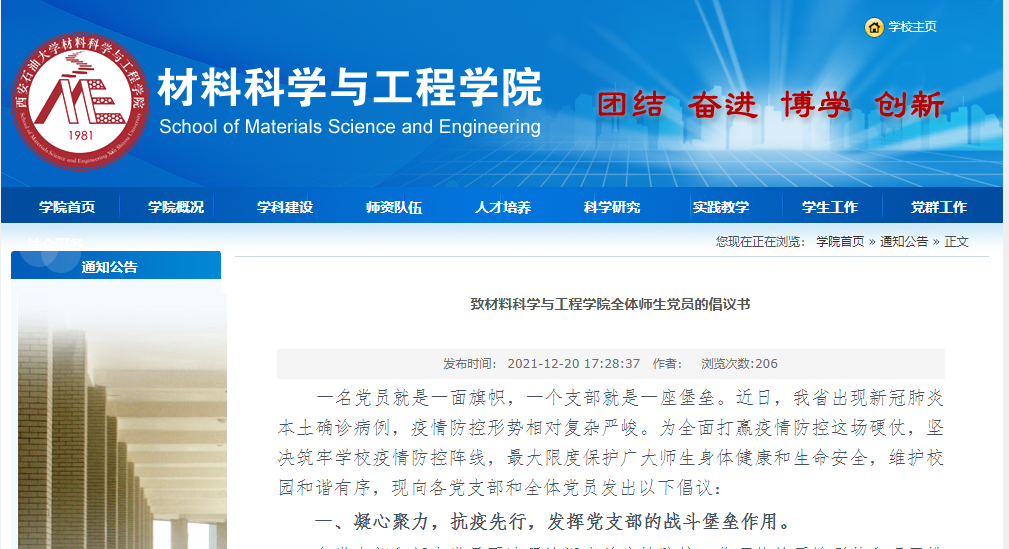 12月20日,材料科學(xué)與工程學(xué)院黨委第一時間發(fā)出《致材料科學(xué)與工程學(xué)院全體師生黨員的倡議書》,號召廣大黨員要迅速投入到疫情防控工作中來,率先垂范、擔(dān)當(dāng)使命,沖在最前、干在最前,用實際行動傳遞黨的聲音,凝聚黨的力量。在這樣的號召下,一個個材料人爭當(dāng)抗“疫”先鋒,用一個個弱小的力量慢慢匯聚到這場疫情阻擊戰(zhàn)的大戰(zhàn)役中。