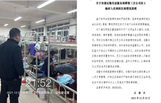為了扎實做好校園封控情況下各項后勤服務(wù)保障工作,后勤處采取緊急動員措施,確保兩校區(qū)為廣大師生員工提供餐飲、住宿、保潔消殺、樓宇管護、設(shè)施設(shè)備維修值守等基本生活服務(wù)保障的人員始終在校在崗。為此,安排和動員了外聘人員、第三方餐飲公司和物業(yè)公司等必須服務(wù)保障崗位上的600多名員工臨時住宿在兩校區(qū)部分樓宇空置房間內(nèi)。令人感動的是,這些員工也無怨無悔,積極響應(yīng),暫舍小家為大家,白天在校園各處服務(wù)保障崗位上服務(wù)師生,晚上在簡陋的臨時休息處睡架子床,甚至鋪床板、打地鋪。同時,后勤處一方面根據(jù)疫情防控要求,特別加強對臨時住宿人員的秩序管理,嚴格進行每天的消殺及衛(wèi)生保潔。另一方面,也要求各中心對所有服務(wù)保障人員給予一定的關(guān)心和關(guān)愛,讓大家住的安心、干得認真。
