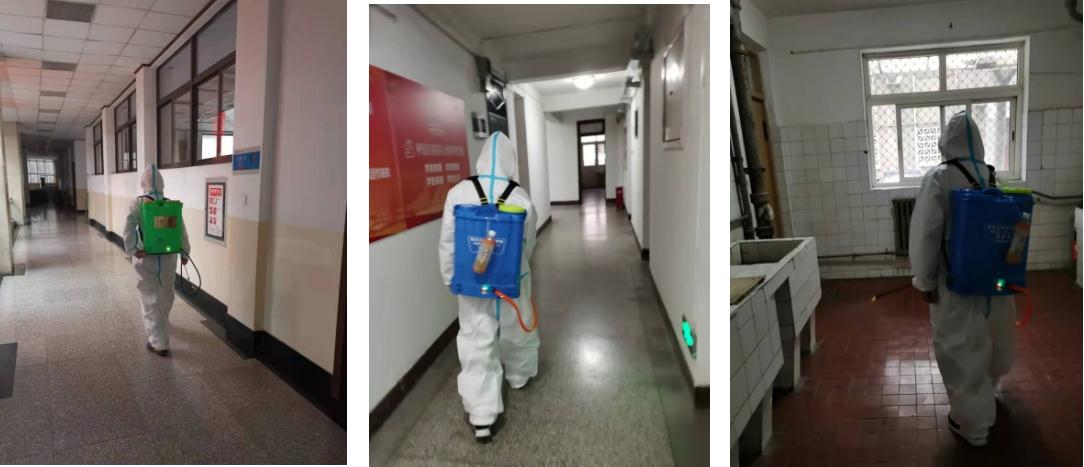 圖:校園內(nèi)開展室內(nèi)外強化消殺噴灑作業(yè)