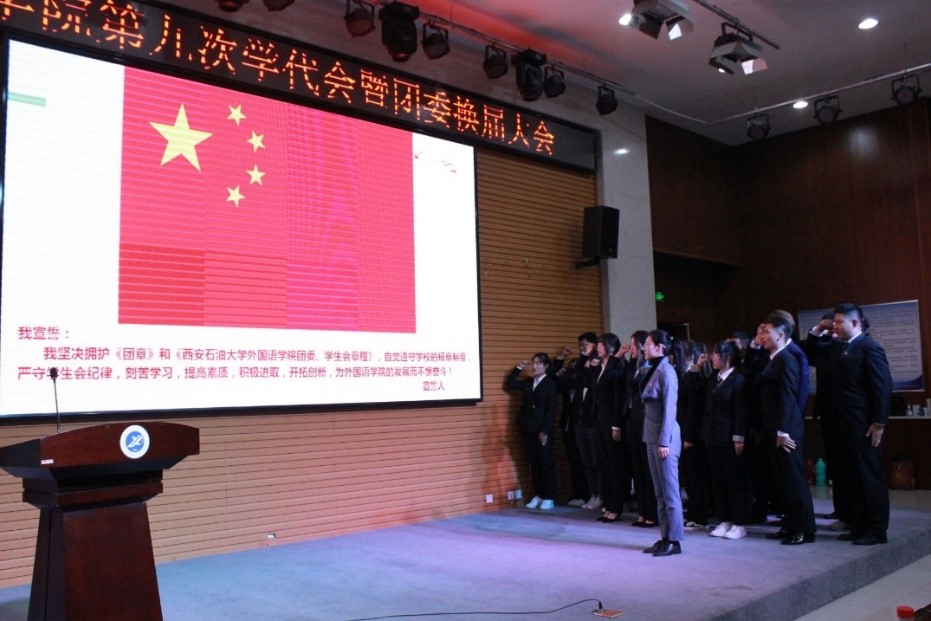 院第九屆學生會指導老師陶李宣讀了《西安石油大學外國語學院第九次學代會暨團委換屆大會選舉辦法》。隨后15位競選人進行競選演講,表達為學院團學工作貢獻力量的決心與熱情。最終,經(jīng)過民主投票,差額選舉確定龐詩凡、徐子涵、睢佳等13位同學為外國語學院第九屆團委、學生會委員。陶李老師帶領(lǐng)當選委員進行宣誓。