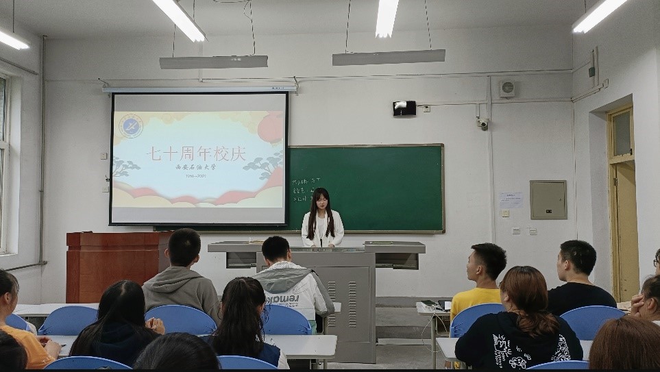 各班級集體學(xué)習(xí)了學(xué)校發(fā)展歷程,觀看了校慶宣傳片《風(fēng)華七秩 薪火不息》和西油相冊等內(nèi)容。其中,翻譯2001班采用“雙語報告”形式,講解建校70周年Logo含義,雙語學(xué)習(xí)了我校發(fā)展歷程,分享我院教授、校友和學(xué)長學(xué)姐風(fēng)采,并號召同學(xué)們要向榜樣學(xué)習(xí),勤奮刻苦、砥礪前行;英語1902班介紹了我校建立的背景、過程,深入學(xué)習(xí)了校史、校風(fēng)和校訓(xùn),領(lǐng)悟我校辦學(xué)精神,張先華、朱雨琦同學(xué),以朗誦的方式慶祝建校70周年,帶領(lǐng)著同學(xué)們回顧了學(xué)校70年來獲得的巨大成就;2021級新生表示,要牢記校風(fēng)校訓(xùn),在堅守奮斗中展現(xiàn)西石大擔(dān)當(dāng),在守正創(chuàng)新中彰顯西石大力量,不負(fù)學(xué)校培養(yǎng)、不負(fù)恩師期望,為學(xué)校的發(fā)展建設(shè)貢獻(xiàn)力量。
