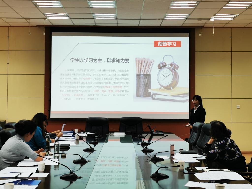 會(huì)上,高榮芳部長(zhǎng)傳達(dá)了本次王濤英才獎(jiǎng)學(xué)金評(píng)選相關(guān)要求,并將各院系推薦參與本次答辯研究生情況作了總體介紹。隨后,參評(píng)研究生按現(xiàn)場(chǎng)抽簽順序進(jìn)行答辯。同學(xué)們通過(guò)精心準(zhǔn)備的PPT,從思想政治、學(xué)術(shù)成果、學(xué)習(xí)成績(jī)、社會(huì)實(shí)踐、綜合素養(yǎng)等方面展示了自己取得的各項(xiàng)成果。評(píng)審委員會(huì)通過(guò)聽(tīng)取擬獲獎(jiǎng)候選人答辯,對(duì)參加答辯的7名“王濤英才”獎(jiǎng)學(xué)金候選研究生進(jìn)行了打分排序,最終產(chǎn)生了1名“王濤英才”獎(jiǎng)學(xué)金擬獲獎(jiǎng)學(xué)生。