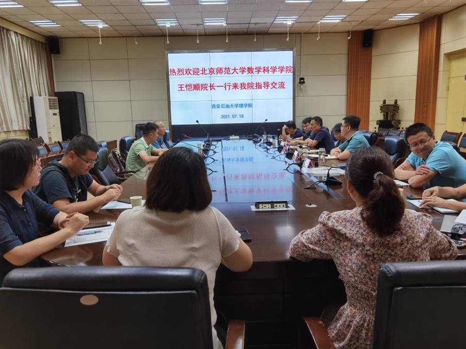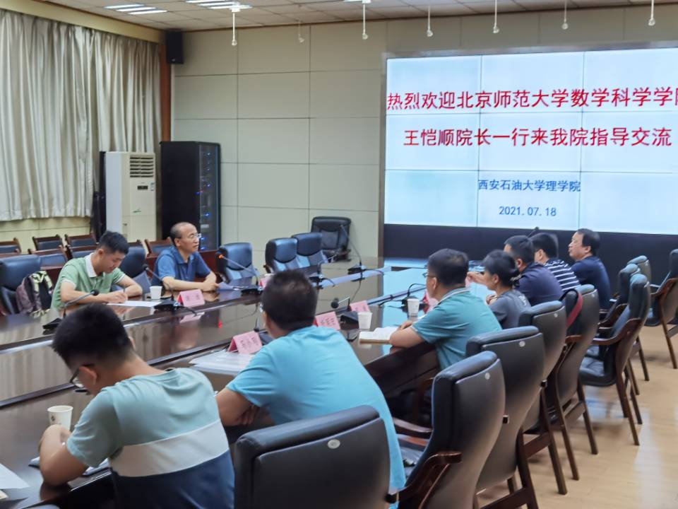 在工作交流環(huán)節(jié),傅海威院長首先介紹了西安石油大學(xué)理學(xué)院的歷史沿革,學(xué)科發(fā)展現(xiàn)狀,師資隊伍建設(shè)現(xiàn)狀,學(xué)院機構(gòu)設(shè)置等情況。王愷順院長詳細介紹了北京師范大學(xué)數(shù)學(xué)科學(xué)學(xué)院的發(fā)展現(xiàn)狀,本碩博招生規(guī)模,專業(yè)課與公共課教學(xué)情況,兩校區(qū)辦學(xué)等情況。雙方就數(shù)學(xué)學(xué)科專業(yè)建設(shè)、人才引進、管理服務(wù)、教師的教學(xué)工作量等問題進行了深入的交流。此外,雙方還就理學(xué)院“應(yīng)用統(tǒng)計學(xué)”專業(yè)學(xué)位點建設(shè)、師資隊伍建設(shè)等難點問題進行了深入的分析、交流和探討。