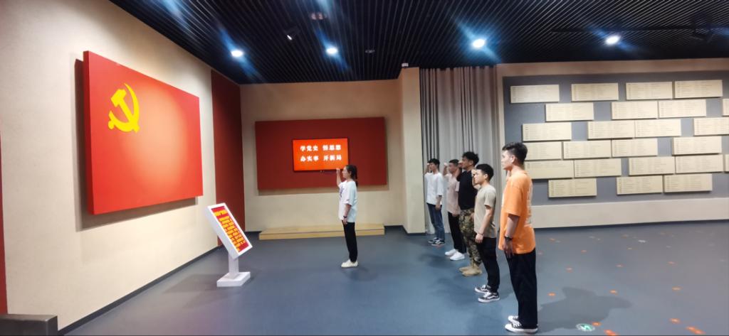 參觀結(jié)束后,班級里的黨員同志們在展覽廳內(nèi)面向黨旗自發(fā)地重溫入黨誓詞,回顧入黨時的錚錚誓言,立志奮進(jìn)新時代,啟航新征程。