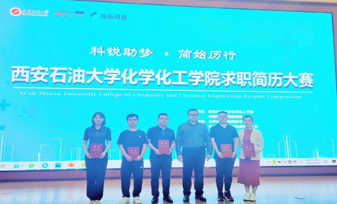 為在校園內(nèi)營造良好的就業(yè)氛圍,幫助同學(xué)們凝練核心競爭力,強(qiáng)化求職技能,在即將到來的求職季收獲理想offer。6月16日下午,由化學(xué)化工學(xué)院學(xué)院聯(lián)合科銳國際醫(yī)脈同道主辦的“科銳助夢·簡始?xì)v行”求職簡歷大賽決賽在我校鄠邑校區(qū)弘石報告廳舉行。西安石油大學(xué)黨委學(xué)生工作部副部長、就業(yè)指導(dǎo)中心副主任、創(chuàng)新創(chuàng)業(yè)中心副主任樊曉旭,西安石油大學(xué)化學(xué)化工學(xué)院黨委副書記祁帆,科銳國際醫(yī)脈同道校園負(fù)責(zé)人范凱賢,科銳國際醫(yī)脈同道金牌講師賀潔,科銳國際醫(yī)脈同道校園商務(wù)總監(jiān)賀洛,大學(xué)生職業(yè)生涯規(guī)劃導(dǎo)師張瑞,西安唐翰科技孵化器有限公司副總經(jīng)理程廣忠出席本次大賽并擔(dān)任評委。我院18、19級共13位參賽選手參加了本次大賽,我院各年級學(xué)生作為觀眾全程觀賽。