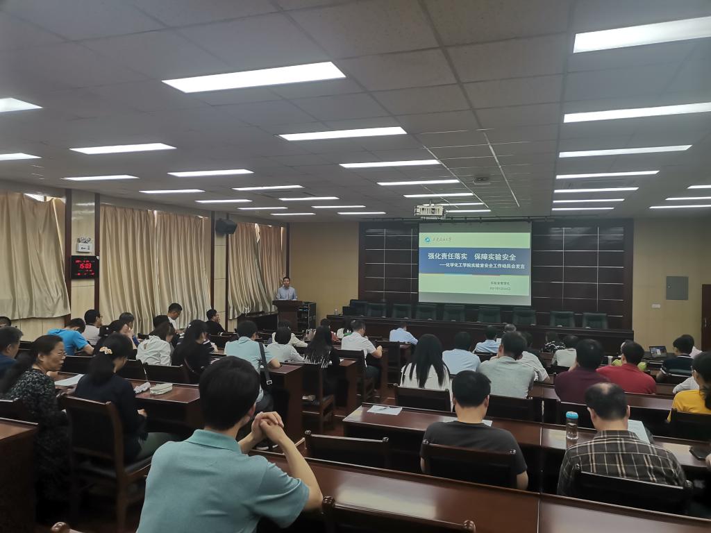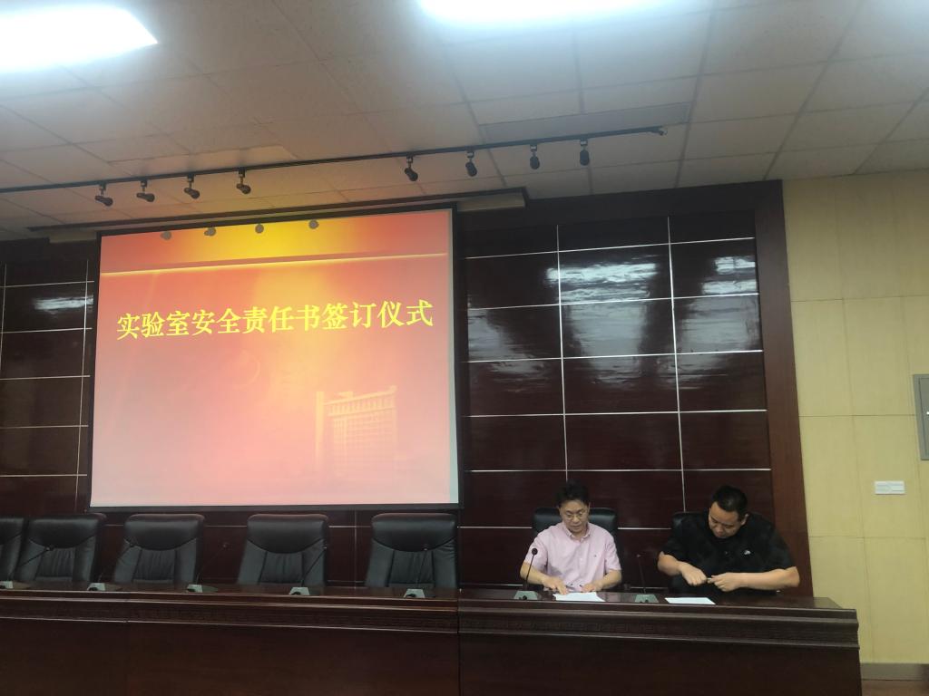 會議第一階段進行實驗室安全檢查動員及部署。首先由實驗管理處副處長李慶本傳達了教育部和陜西省教育廳《關(guān)于組織開展2021年度高等學(xué)校實驗室安全檢查工作的通知》,李慶本副處長從近年來國內(nèi)影響重大的化工類安全事故出發(fā),指出做好實驗室安全工作應(yīng)該作為學(xué)院每位教師的基礎(chǔ)性和日常性工作,并對照中省有關(guān)實驗室安全文件精神要求,指出學(xué)院實驗室目前存在的管理漏洞和安全問題,希望各實驗室負責(zé)老師認清責(zé)任,狠抓落實,把實驗室安全事故扼殺在萌芽狀態(tài)。李善建副院長介紹了學(xué)院落實實驗室安全工作的具體措施:一是高度重視實驗室安全工作,切實加強組織領(lǐng)導(dǎo);二是簽訂安全責(zé)任書、逐級分層落實安全責(zé)任;三是嚴(yán)格落實實驗室安全準(zhǔn)入制度,確保實驗室安全運行;四是認真開展自查自糾,扎實做好排查整改工作;五是強化制度執(zhí)行,嚴(yán)肅責(zé)任追究。會上,由現(xiàn)代分析檢測中心主任賈新剛老師和化學(xué)化工實驗教學(xué)中心主任張新強老師分別代表科研實驗室和教學(xué)實驗室與分管領(lǐng)導(dǎo)簽訂了《化學(xué)化工學(xué)院實驗室安全責(zé)任書》。