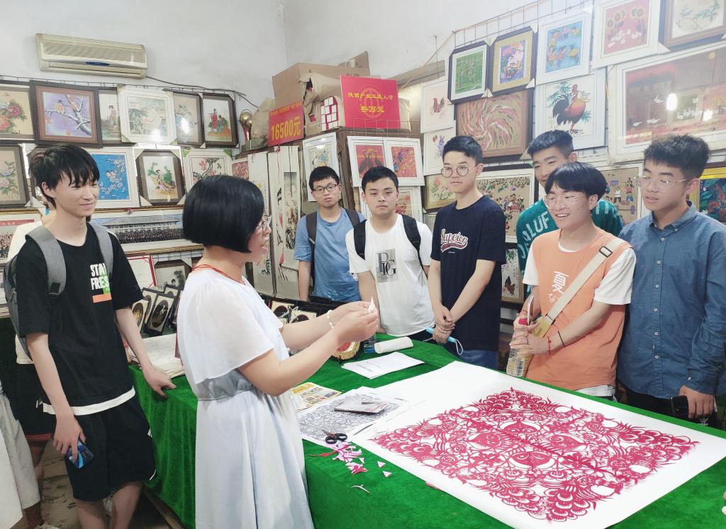 在中國(guó)公益廣告藝委會(huì)首屆委員、戶縣農(nóng)民畫(huà)一級(jí)畫(huà)家、西安十佳工匠之星王乃良老師的帶領(lǐng)下,師生參觀了王乃良農(nóng)民畫(huà)精品畫(huà)室,王老師詳細(xì)介紹了幾幅他的《黃河魂》、《耕讀傳家》、《勤勞人吉祥人》等經(jīng)典作品,通過(guò)他的介紹和引導(dǎo),同學(xué)們了解了鄠邑農(nóng)民畫(huà)的歷史與發(fā)展歷程、藝術(shù)進(jìn)步與成就、農(nóng)民畫(huà)的推廣與宣傳情況。同時(shí),中國(guó)美協(xié)陜西分會(huì)會(huì)員、戶縣農(nóng)民畫(huà)一級(jí)畫(huà)家朱丹紅老師,從剪紙的創(chuàng)作過(guò)程、剪紙的技法、代表作品的解讀等方面給大家展現(xiàn)了剪紙的魅力、感染力,現(xiàn)場(chǎng)為大家剪出兩幅作品,當(dāng)作品展開(kāi)時(shí),現(xiàn)場(chǎng)發(fā)出驚嘆聲和雷鳴般的掌聲,被老師的精湛的剪紙技藝所折服。兩位老師用精湛的繪畫(huà)、剪紙的民間技藝,很好的詮釋了鄠邑當(dāng)?shù)鬲?dú)特的藝術(shù)風(fēng)格,展現(xiàn)民族藝術(shù)魅力和傳統(tǒng)藝術(shù)的情感表達(dá),學(xué)生在參觀學(xué)習(xí)的過(guò)程中,深入感受到了傳統(tǒng)文化的魅力,了解了新時(shí)代鄉(xiāng)村的村風(fēng)村貌。